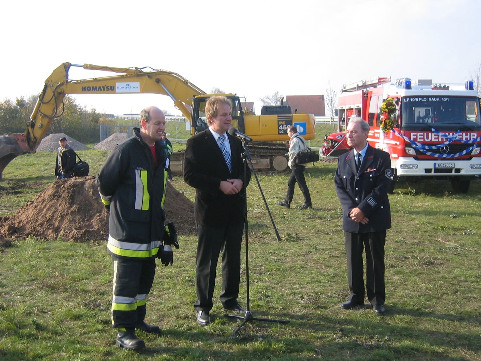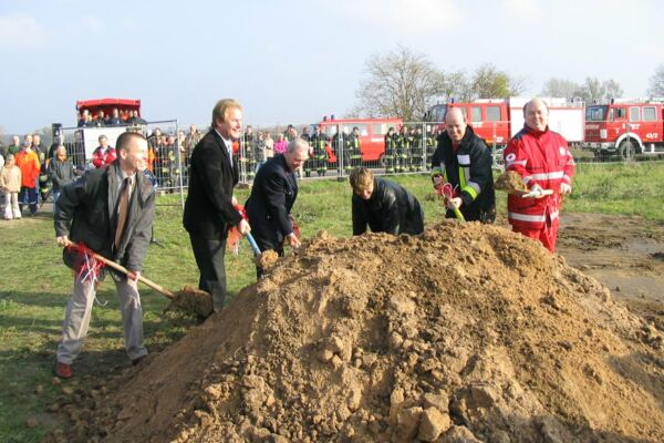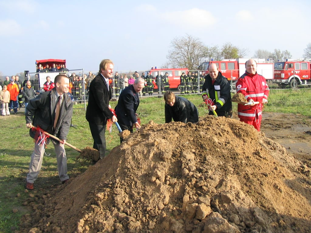 Nach einem Jahr der Entscheidungen für ein neues Feuerwehrhaus auf gemeindeeigenem Grund bei der Kläranlage, Erstellung von Konzept und Plänen, Änderung des Flächennutzungsplans und Erstellung eines Bebauungsplanes, einer Genehmigungszeit von drei Wochen für den Bauantrag, konnte mit dem Bau begonnen werden. Zugesagt war auch ein Landeszuschuß in Höhe von 421.000 Euro. Als nun auch der Gemeindehaushalt 2005 mehrheitlich von der Gemeindevertretung beschlossen war - das Feuerwehrhaus sollte 3,2 Mio. Euro kosten - konnte nach einer Bearbeitungszeit von fast einem weiteren Jahr — Umplanung und Ausschreibung — mit dem "ersten Spatenstich" der Bau begonnen werden. Warum damals ein neues Feuerwehrhaus? Von der Gemeindevertretung wurde mit großer Mehrheit im Dezember 2003 beschlossen, ein neues Feuerwehrhaus andernorts zu bauen, statt das auf dem "Feldchen" existierende Gebäude zu sanieren und zu erweitern.