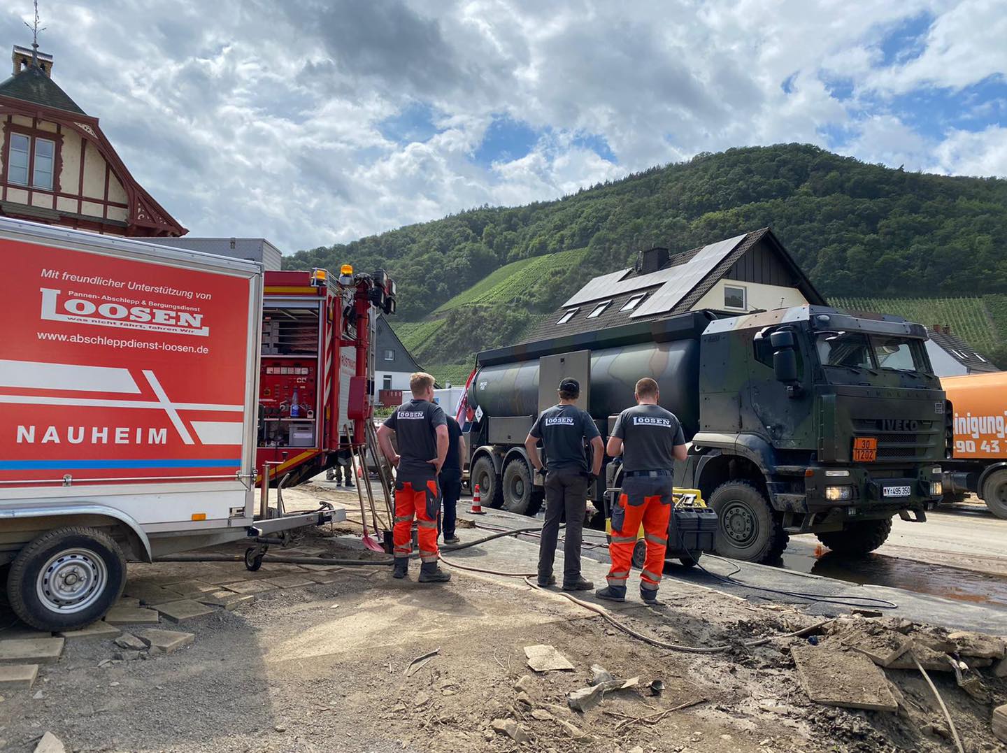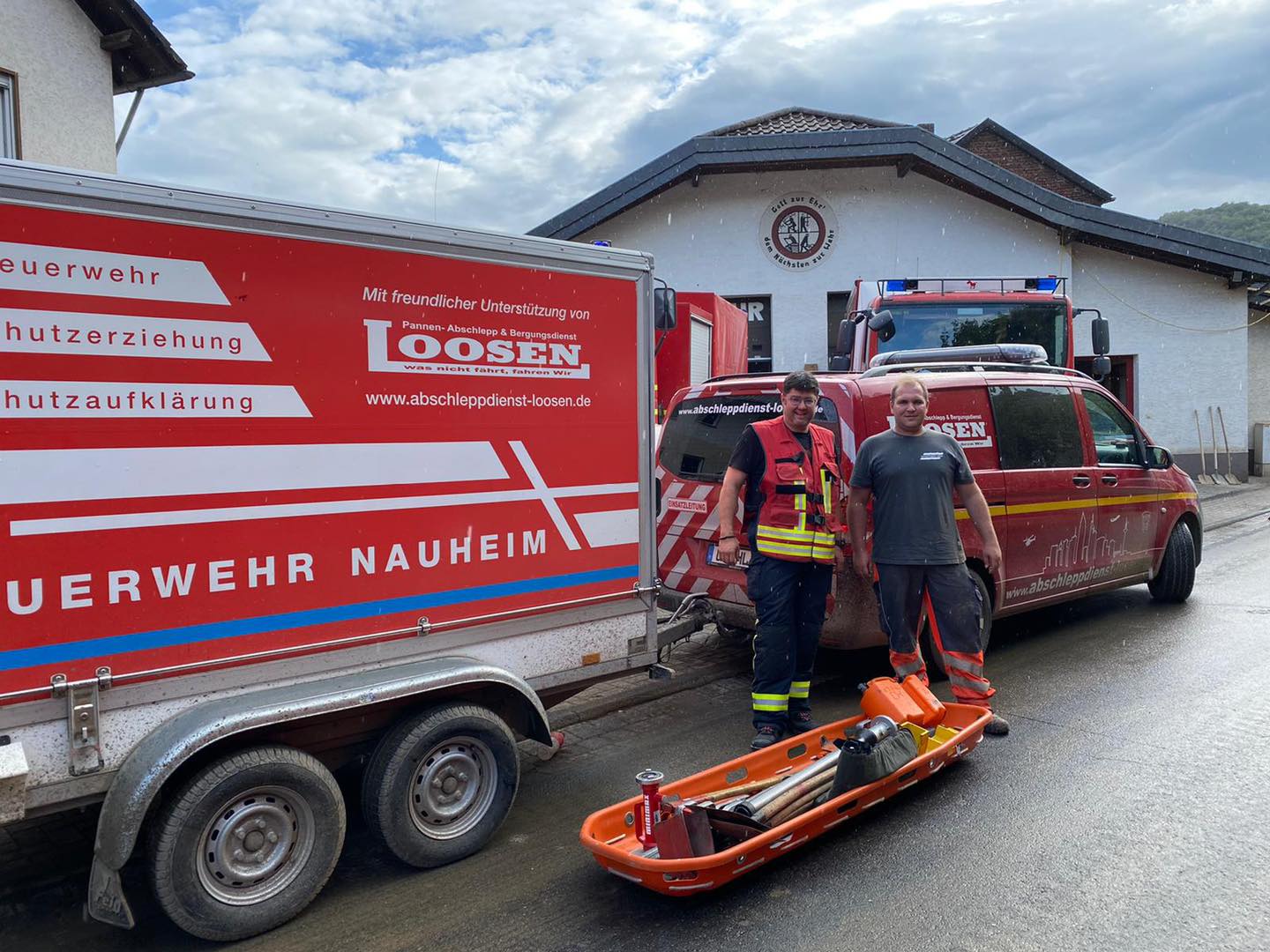 Unser Partner Abschleppdienst Loosen bietet in der Verbandsgemeinde Altenahr ehrenamtlich seine UnterstĂŒtzung an. RĂ€umung mit schwerem GerĂ€t, Demontage, Bergung und StraĂenreinigung. Um einen dringend benötigten Hochdruckreiniger zu transportieren, fehlte ihm der Platz. Der Förderverein der Freiwilligen Feuerwehr Nauheim stellte ihm kurzerhand einen AnhĂ€nger zur VerfĂŒgung, um das GerĂ€t und das passende Zubehör zu transportieren.