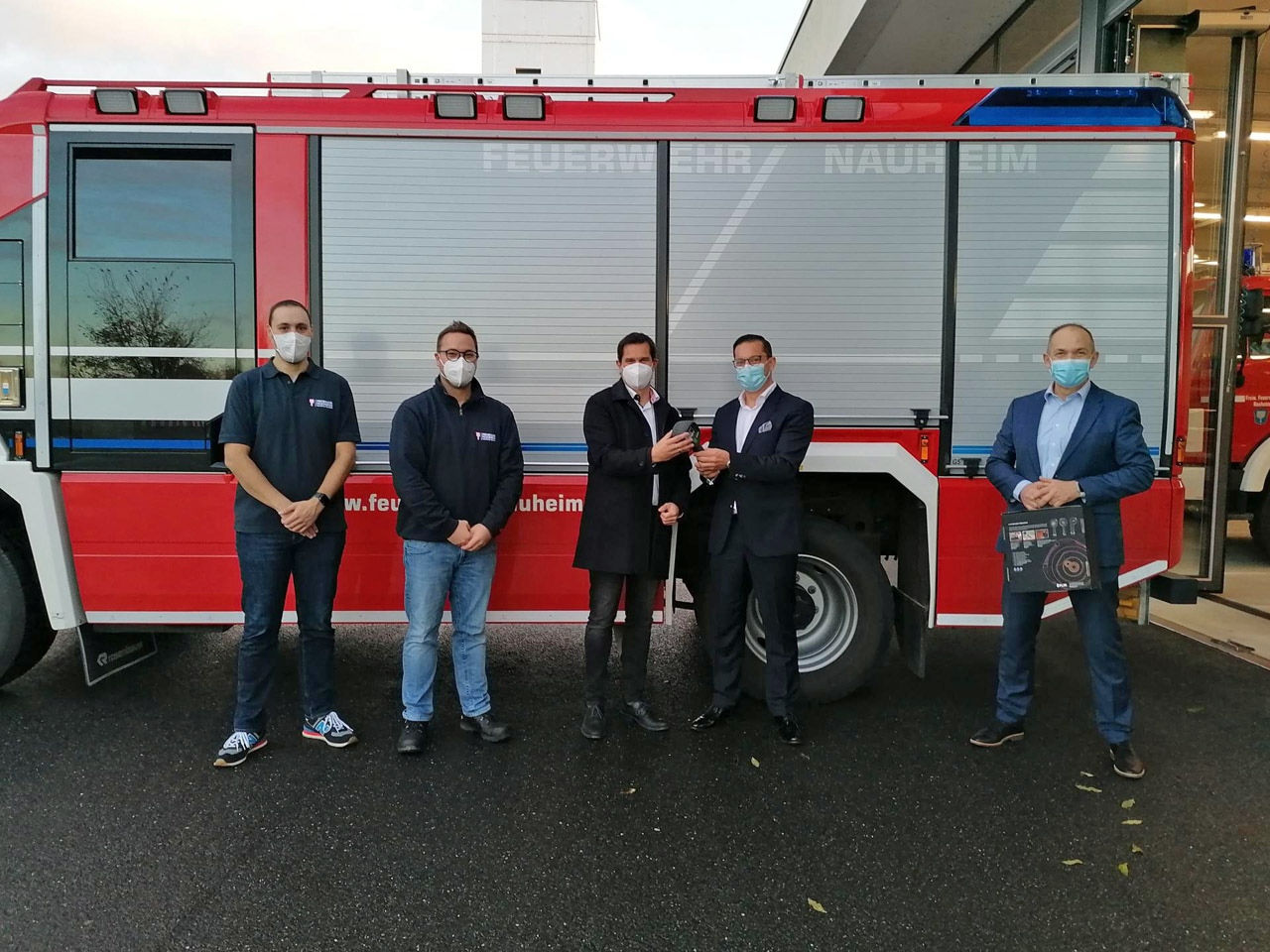 Zur Übergabe der Kamera war Eifert gemeinsam mit Nasser Radaideh, Geschäftsstellenleiter der SV SparkassenVersicherung im Hause der Kreissparkasse Groß-Gerau gekommen. Nauheims Bürgermeister Jan Fischer nahm das Gerät gemeinsam mit Gemeindebrandinspektor Christian Hartmann und seinem Stellvertreter Daniel Becker in Empfang.