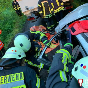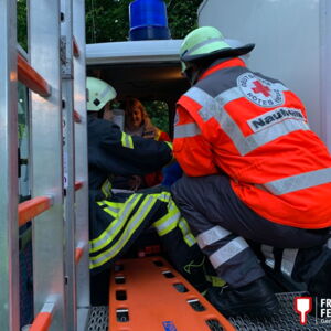 Angenommen wurde ein Verkehrsunfall mit insgesamt drei beteiligten Fahrzeugen (ein LKW und zwei PKW) und drei verletzten Personen, wovon zwei in ihren Fahrzeugen eingeklemmt waren. Die Fahrerin des LKW war im Beckenbereich verletzt und musste per Rettungsplattform und unter zur Zuhilfenahme eines Spineboards aus dem Fahrzeug gerettet werden.