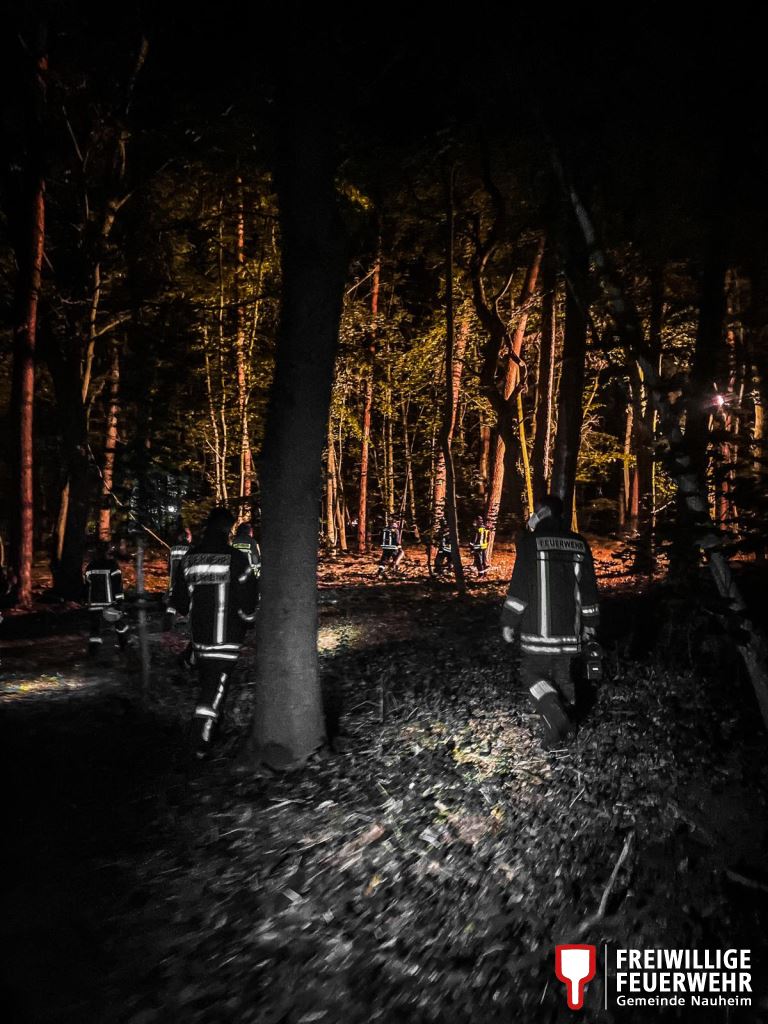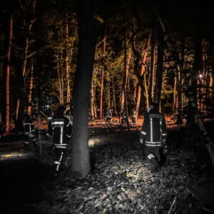 Weiter ging es dann mit der Suche nach 2 vermissten Personen im Wald. Dies wurde in zwei Varianten ausgeführt. Gestartet wurde mit der Menschenkette. Hierbei gehen möglichst viele Personen in kurzem Abstand nebeneinander ein Gebiet ab und suchen nach den Vermissten. Um den Unterschied im Personal- und Zeitaufwand zu verdeutlichen, durften zum Abschluss des Übungsabends die Flächensuchhunde unserer Rettungshundestaffel ihr Können unter Beweis stellen.