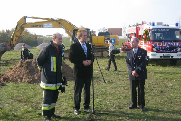 Nach einem Jahr der Entscheidungen für ein neues Feuerwehrhaus auf gemeindeeigenem Grund bei der Kläranlage, Erstellung von Konzept und Plänen, Änderung des Flächennutzungsplans und Erstellung eines Bebauungsplanes, einer Genehmigungszeit von drei Wochen für den Bauantrag, konnte mit dem Bau begonnen werden. Zugesagt war auch ein Landeszuschuß in Höhe von 421.000 Euro. Als nun auch der Gemeindehaushalt 2005 mehrheitlich von der Gemeindevertretung beschlossen war - das Feuerwehrhaus sollte 3,2 Mio. Euro kosten - konnte nach einer Bearbeitungszeit von fast einem weiteren Jahr — Umplanung und Ausschreibung — mit dem "ersten Spatenstich" der Bau begonnen werden. Warum damals ein neues Feuerwehrhaus? Von der Gemeindevertretung wurde mit großer Mehrheit im Dezember 2003 beschlossen, ein neues Feuerwehrhaus andernorts zu bauen, statt das auf dem "Feldchen" existierende Gebäude zu sanieren und zu erweitern.